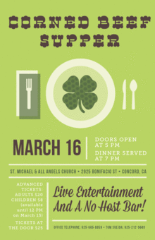 Celebrate the season of the Irish on St. Patrick's Eve--Saturday March 16 with a corned beef supper featuring live music and a no host bar. Doors open at 5, dinner is served at 7! Some terrric prizes will be raffled off as well. Profits go toward the ministries of St. Michael's Church.
