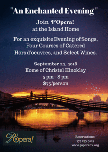 We have planned an exquisite evening of delectable Foods paired with select Wines and surrounded by beautiful Songs from our P'Opera! artists. The Beautiful setting is a private home situated on an island in southwest Reno. Seating is limited.