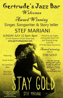 Stef Mariani will be singing songs from her 2018 Na Hoku Hanohano Award wining album Stay Gold and debuting her 30 minute Short Film. Concert will also feature guest artists Pat Eskildsen, Duke Tatom and Noa Eads.
