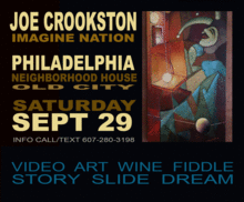 From Ithaca NY, Joe Crookston is bringing his fiddle, his slide guitar, hilarious stories, universal songs, gorgeous visual art for a night that will leave you feeling more awake and alive with a renewed sense of what's possible. Sublime beauty, Visual Art Show, Wine, Songs and Human Stories at the Neighborhood House Theater in Old City Philadelphia, Saturday September 29th 2018.