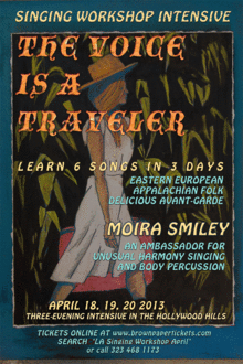 "The Voice Is A Traveler" Singing Workshop with Moira Smiley in the Hollywood Hills At the Besant LODGE, 2560 1/2 North Beachwood Drive, CA 90068 Thu-Fri-Sat, April 18-19-20, 2012 Each of the three evenings are 7:30-10:30pm Singing & Body Percussion Workshop The Workshop is built for 3-evening 'Full' participants, but you can also choose to be a 'Half' participant and choose two evenings to attend. Doors open at 7pm.