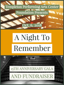 This event is to celebrate the 15-year anniversary of the opening of the Templeton Performing Arts Center. It will be a night to remember and acknowledge the many donors past and present, and the administrators, architects, and people that contributed to the building of this wonderful facility. Invited VIPs, current stakeholders, and the public will enjoy an evening of entertainment, showcasing a variety of talent in the fine and performing arts areas. This will be a FREE event. No cost to enter with limited seating. *Reservations are required.* Please be on time. If you are late, your seats may be given to someone waiting in line.