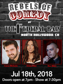 It's Rebels of Comedy at the Federal Bar in North Hollywood. Come out and see a night of live comedy, featuring an awesome lineup of professional features and headliner comedians.
