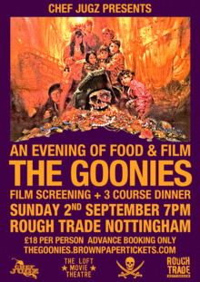 The ticket price includes a screening of the Classic 1985 action adventure comedy The Goonies and a three course Italian menu - inspired by Mama Fratelli and lovingly prepared by Chef Jugz!