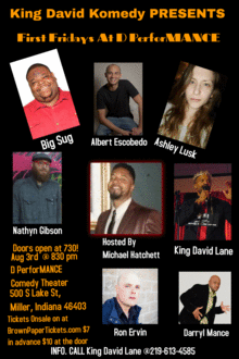 The First Friday of the month we put together a great line up of stand up comedy and/or improv. This month's show features Michael Hatchett as your host with a stacked line up of Chicago/NWI talent including the very funny Ron Ervin, Albert Mora Escobedo, Darryl Perfor Mance, Big Sug, Nathyn Gibson, & Ashley Lusk! Tickets can be bought from King David or on BrownPaperTickets.com at the link below. $7 in advance or $10. Doors open at 7:30! Show starts at 8:30. Music playing before & after the show.
