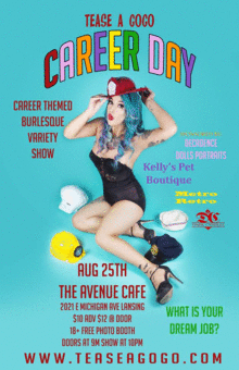 Come one, come all to Tease-A-Gogo Career Day! Why go to work when you can take a night off to watch fabulous array of burlesque variety talent from across the state tease and please your senses! As always, feel free to dress for success as the occupation you have (or the occupation you want), eat some scrumptious food by Ruckus Ramen and drinks by The Avenue Cafe, and enjoy our free career day themed photo booth!