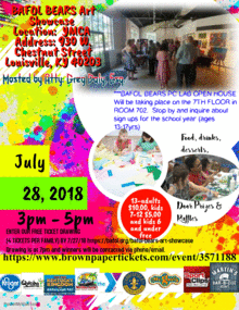 BAFOL BEARS Art Showcase is a fundraiser to provide FREE educational ARTs Based exposure of our summer programs in Louisville, Kentucky for high functioning children (ages 8-12 yrs) on the Spectrum of Autism. The showcase also provides an opportunity for local artist and students to be paired up and mentored by the local artist. And, the showcase focuses on art, nutrition, science and community building relationships for the special needs families. This fundraiser will also assist with funding creative workshops, NO SCHOOL activities - a summer program that brings artists, scientists, chefs and educators to the Summer Youth Camps-based intensive workshops to the kids that would otherwise not have an avenue for such opportunities. While the students are paired up with a local artist (Kenn Parks, Rachel Jenkinson, Angela McBroom Porter, DWayne Whidby), from the community as a "Big Buddie" or Mentor to shadow and work with a professional in selling and speaking about EACH OTHERS masterpieces to the public, the attendees can purchase the students artwork.