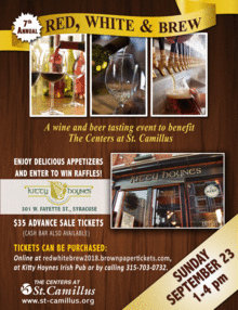 Red, White & Brew is a wine and beer tasting event to benefit The Centers at St. Camillus and affiliate Integrity Home Care Services. For only $35, enjoy your choice of various wine and beer samplings at Kitty Hoynes Irish Pub in Syracuse. In addition, complimentary hot and cold appetizers will be served and we'll be sure to have the games on TV. Enter to win one of our many raffles and all guests will take home a gift bag compliments of our sponsors. Bring your friends for an afternoon of fun! (A cash bar will also be available.) Save the Date: SUNDAY, SEPTEMBER 23(1-4pm). For more information, call 315-703-0732 or 315-703-0822. Hope to see you there!