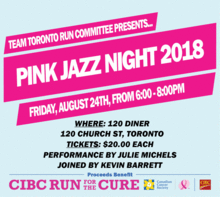 Join the Toronto Run Committee at 120 Diner for our Pink Jazz Night 2018 in support of CIBC Run for the Cure. Featuring veteran Toronto jazz vocalist, Julie Michels, and guitarist Kevin Barrett. Its an event you dont want to miss!