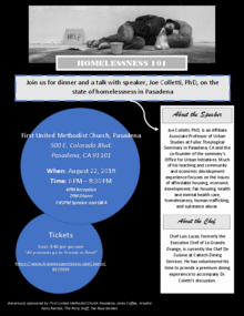 Please join us for Homelessness 101 which includes a 3 course dinner crafted by Chef Luis Lucas followed by a talk by Joe Coletti on the state of homelessness in Pasadena and a q&a. The hope is that guests of this event will leave with a deeper understanding of the nuances of homelessness in Pasadena, what is currently being done about it, and how one might contribute to the current efforts to provide support to the disenfranchised.
