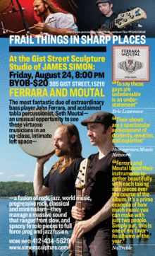 The John Ferrara & Seth Moutal Duo will bring their visionary blend of progressive rock, jazz, minimalism and world music to Pittsburgh.They will feature their new alblum "Frail Thing in Sharp Places, a vibrant world of hypnotic percussion and soaring melody.The duo is Acclaimed Virtuosic bass player John Ferrara, bassist for globetrotting psych-fusion stalwarts Consider the Source considered one of the top in the world these days,and the super talented percussionist Seth Moutal. See these guys in a wonderful intimate space at James Simons Sculpture studio loft in the Uptown neighborhood of Pittsburgh-