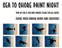 We will be painting water and shore as our background and you will have your choice of sea creature silhouette to add. We make paint night fun and easy for any skill level with out traceable templates.