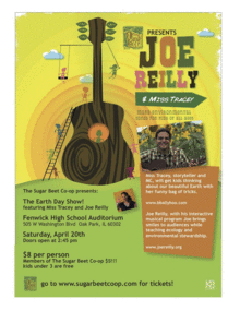 Miss Tracey will bring her hilarious storytelling style and engaging props to get our kids thinking about our Earth in a new way. Joe Reilly is traveling all the way from Ann Arbor to help us celebrate Earth Day with his fun and funky songs that explore everything from biodiversity to endangered species! Come out to learn more about The Sugar Beet Co-op, too!