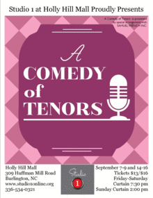 A Comedy of Tenors by Ken Ludwig...One hotel suite, four tenors, two wives, three girlfriends, and a soccer stadium filled with screaming fans. What could possibly go wrong? Its 1930s Paris and the stage is set for the concert of the century as long as producer Henry Saunders can keep Italian superstar Tito Merelli and his hot-blooded wife, Maira, from causing runaway chaos. Prepare for an uproarious ride, full of mistaken identities, bedroom hijinks, and madcap delight.
