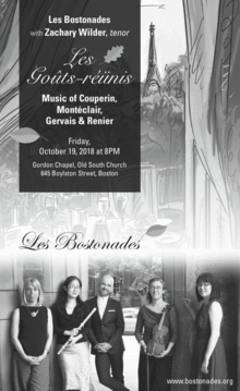 Les Bostonades kicks off its 20182019 season on Friday, October 19 featuring the return of the internationally acclaimed tenor Zachary Wilder. The concert, "Les Goûts réunis", whose title is taken from a collection of chamber works by François Couperin (16681733), celebrates music of the reunited tastes of French and Italian styles from the first half of the 18th century.