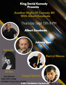 The hilarious Albert Escobedo returns to ANOC headlining a great free night of stand up comedy along with Darryl Mance, Johnny See, Keegan Damron, & 38 Dee. DJ NRG will be spinning music all night long too. As an added bonus T William McHuckleberry & King-David Lane for no extra charge! As an added bonus Todd McNeeley & King-David Lane for no extra charge!