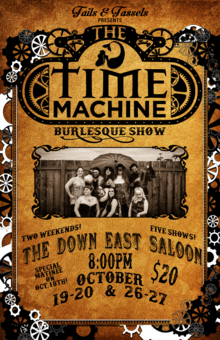 Tails & Tassels Burlesque is back with an all new exciting, steampunk time traveling play! Where fan favorite Captain Booty Snarl returns as the Doctor who has done it. He has invented the Time Machine. Join this brave crusader as he travels through time searching for Keystones of energy aka Fuel that will power his miraculous machine. Join us for a fully interactive Steampunk experience. Costume Contest on Saturday 27th of October.