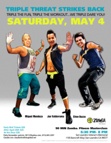 Join the Original Triple Threat for 90mins of Crazy, Sexy, Cool Fun Zumba Master Class with ZJ Efren Bazzo, Joe Valderrama & Miguel Mendoza! Don't miss out on triple the Fun, Triple the Workout... We triple dare you!!!