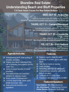 SHORELINE REAL ESTATE: Understanding Beach and Bluff Properties is a full day seminar for realtors and assessors to better understand coastal processes and how to assess coastal hazards and risks for waterfront properties. The seminar is taught by local experts and provides 7.5 clock hours.