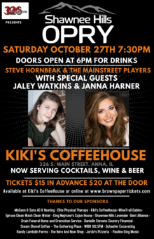 We are excited to announce that the new home for the Shawnee Hills Opry will be at Kiki's CoffeeHouse. With Kiki's expansion they can now seat 80 people. They have also added a bar for special events. Doors will open at 6pm for cocktails and the show starts at 7:30. It's general seating so no reserved seats. Come have dinner at one of our downtown restuarants that are offering discounts by showing your Shawnee Hills Opry ticket. Jordo's Pizzeria is offering 20% off your dinner from 4pm to 8pm. We will list other dinner specials as they come in. We want this to be a Downtown Anna event that brings people to our wonderful local businesses!