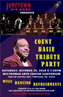Jumptown Big Band is proud to present a Count Basie Tribute Party. Last years Stan Kenton Tribute Party was such a success that we were asked to perform again. This year we will be performing instrumental arrangements from the library of the Count Basie Orchestra that will feature our outstanding soloists along with vocal charts featuring Claudia Knauer, one of Portlands top big band vocalists. The Count Basie Orchestra is arguably one of the greatest and most well-known big bands in swing music history. This event will feature a wide variety of Count Basie classics as well as some gems that dont often get performed by live big bands. We are calling this event a party rather than a concert or dance because it will be both. If you are a swing dance fan, this event will keep your feet moving. If you are a concertgoer, you will find this event an exciting evening of aural delight.