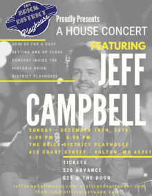 Enjoy a cozy Saturday evening with singer and songwriter, Jeff Campbell for an up close and personal House Concert inside our Historic Brick District Theater! Tickets: $20 Online/Advance and $25 at the Door 4p - 6p Food and Drinks will be available for purchase.