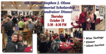Join us for the 4th Annual Stephen J. Olson Memorial Scholarship Fundraiser! Ticket includes Wine Tastings, Dinner, and a Silent Auction. Dinner will be baked pasta, pizza, meatballs in marinara, salad, and artisan bread. Come support a great cause while having a great time!