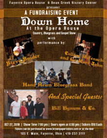 Fayette Opera House proudly presents our Bi-Annual Fundraiser, Down Home at the Opera House. Our October show will be featuring awesome performances by Steve Snider, Colleen Rufenacht and Go Kart John, and returning to our stage, Hand Hewn Bluegrass Band. Our Special Guests for the evening is Bill Bynum & Co from the Ann Arbor area. Bill and his band will perform Bluegrass, some country, some original songs and a little bit of Moe Town sound done in their own style.