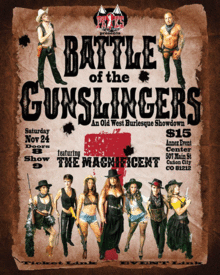 Peaks and Pasties, Colorado's Burlesque Super Troupe will be bringing an all western themed burlesque show to Canon City on the Saturday after Thanksgiving! Battle of the Gunslingers will star two of Colorado's up and coming Boylesque performers Romeo Uncaged and Cativo Burlesque. The show will also feature some of Peaks and Pasties biggest stars as the Magnificent 7. Produced by Canon City's own Ms Tryss. You won't want to miss all of the lasso spinning and tassel twirling excitement! Must be 21+ Doors open at 8pm, show starts at 9pm Starring: Romeo Uncaged Cattivo Burlesque Vesper Savauge Foxie Dreame Holly Amorous Dahlia Bloom Red Pearl Jenny De La Muerde Miss Terrie MisTryss Mafia Raven Necromancia Crimson Coyote Scarlet Raven Colorado Flower Pena Colada Guest Performer: Astoria Lust