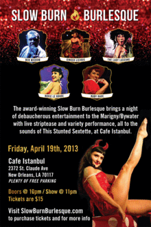 Slow Burn is gonna shake it and make it funky Friday April 19th as we invade the Marigny/Bywater to bring you a night of wild entertainment New Orleans style at Café Istanbul. We have the most red-hot burlesque in New Orleans brought to you by the best in the biz! In the house will be Ginger Licious, Roxie le Rouge, Ruby Rage, Lady Lucerne, and host Ben Wisdom, with live music from Dahktur Sick and This Stunted Sextette.