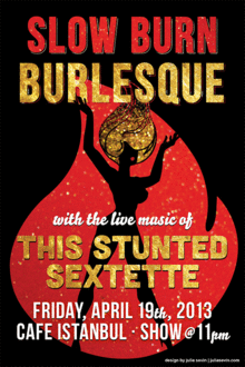 Slow Burn Burlesque is the most thrilling show in New Orleans! Combining classic style and glamour with punk rock attitude, and rock and roll fury, Slow Burn sets stages on fire with outrageous antics, glamorous routines, and hilarious behavior. Each show is bursting with over the top entertainment provided by our seductive core cast of performers and special guests from around the world, all to the quakin' sounds of our live band, This Stunted Sextette!