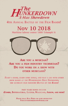 An event for the unsung heros of the Vancouver film community. We technicians are heart and soul of this booming local industry and we have the pleasure to work alongside other creative and like minded individuals everyday. The strengths of our respective unions and guilds is that they are full of incredibly talented people who are passionate about their craft. Passionate about other aspect of the arts community too. We want to showcase some of those people here. The Hunkerdown Xmas Showdown is meant to bring film bands together. There are way to many bands that have film tech player in one night though, so we had to get creative. Owner/Operator productions has put forward a challenge to the musicians and entertainers of our community.