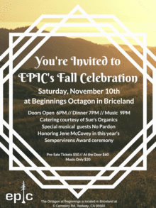 EPIC will celebrate 41 years of environmental activism on Saturday, November 10th at the Beginnings Octagon in Briceland. Folk trio No Pardon will play some toe-tappin' fiddle tunes and Sue's Organics will be cooking up a delicious feast as EPIC family and friends reminisce about the old days and strategize for what's to come. This year, the 2018 Sempervirens Lifetime Achievement Award will be presented to Jene McCovey, for a lifetime of environmental activism.