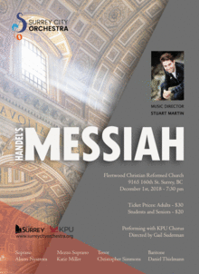 Surrey City Orchestra presents Handel's Messiah featuring the Kwantlen Polytechnic University Chorus. Led by Stuart Martin with soloists soprano Alison Nystrom, mezzo soprano Katie Miller, tenor Christopher Simmons, and baritone Daniel Theilmann.