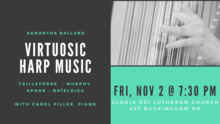 A program loaded with difficult and delightful harp music from diverse time periods, you do not want to miss this performance!
