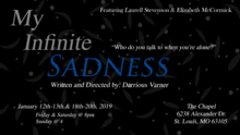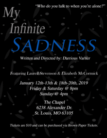 When left alone in one's own mind, who is it that you are really talking to? Step into the subconscious of a person suffering with Depression. See the ups and downs, the twists and turns, the aches and pains that are living with mental illness. Playwright Darrious Varner introduces you to a whole new view of Depression with My Infinite Sadness. By personifying Depression, giving it a face and a voice, he shows just how hard the struggle can be, even on good days.