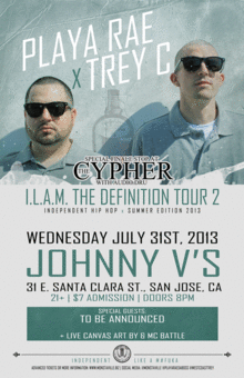 When: Wednesday July 31st, 2013 Where: Johnny V's - San Jose, CA Time: 8pm Cost: $7.00 Ages: 21+ Why: Because you love GOOD live Hip Hop
