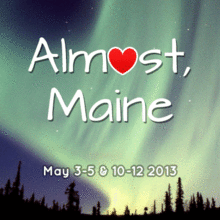 Almost, Maine by John Cariani Directed by Joe Culley with special permission from Dramatist Play Service Inc. On a cold, clear moonless night in the middle of winter, all is not quite what it seems in the remote, mythical town of Almost, Maine. As the Northern Lights hover in the star-filled sky above, Almost's residents find themselves falling in and out of love in unexpected and often hilarious ways. Knees are bruised. Hearts are broken. But the bruises heal and the hearts mend ~almost~ in this delightful midwinter's night's dream. Show Dates: May 3,4,5 & 10,11,12 / 2013 Location: The Buggy Wheel Pavilion at The Expo Center Porter County Expo Center and Fairgrounds 215 East Division Road Valparaiso, IN 46383 Tickets are $10.00 per seat general admission seating Charities that will benefit from this show are as follows: May 3rd. NW Indiana Literacy Foundation May 4th. Opportunity Enterprises May 5th. March Of Dimes May 10th. National Alliance for Mental Health May 11th. PCASC (ramp building project)- Building handicap ramps for those who cannot afford them. May 12th. Valparaiso Women's Club