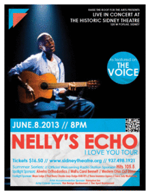 A finalist from the Hit TV Series the Voice, Nelly's Echo is an acoustic band whose African background and everyday life reflects through his musical performances. Nelly's Echo formed in 2007, has been compared to artists such as Jason Mraz and John Mayer. He has successfully release two albums and has held concerts all over the US and internationally. The group promises to engage fans by bringing an electrifying, grove infused vibe to the stage. His positive message of life, love, and hope is clearly expressed through his song lyric.