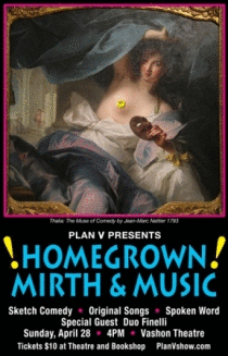 The show contains adult themes so parental guidance is advised or you may have some explaining to do. Even though the poster features a partially clad Thalia, the Muse of Comedy in the classic 18th century painting, there will be no intentional nudity during the show. However, souls may be bared for the sake of humor. Tickets are $10 and will be available early April at The Vashon Theatre and Vashon Bookshop. Email SmileyFace@PlanVshow.com LIKE US ON FACEBOOK Homegrown Mirth & Music Sketch Comedy - Original Songs - Spoken Word Special Guest Circus Finelli Sunday, April 28 - 4PM - Vashon Theatre $10 per Person