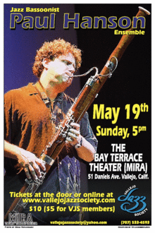 Paul has traveled throughout Europe, Japan and the States. He has appeared as a bassoonist at Carnegie Hall, the North Sea Jazz Festival, the Berlin Jazz Festival, Monterey Jazz Festival and countless other venues. On May 19 he will be performing with his ensemble comprised of some of the Bay Area's finest musicians--guitarist Dave McNab, bassist Jeff Denson, and Jeff Marrs on drums.