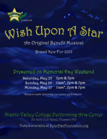 The Peter Pan Foundation proudly presents the seventh annual production of "Wish Upon A Star". This original magical musical adventure features nearly 200 children and young adults. An enchanting show that is fun for the entire family, and all ticket proceeds benefit Children's Hospital and Research Center Oakland. Be a part of the magic, and help us teach young hearts to learn to fly!