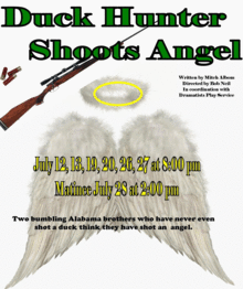 DUCK HUNTER SHOOTS ANGEL is the uproarious story of two bumbling Alabama brothers who have never shot a duck but think they have now shot an angel. As they lament their fates in a murky swamp, they are chased by a cynical tabloid journalist and his reluctant photographer, who don't believe any of ituntil feathers, wings and a tiara are discovered along the way. The play hysterically interweaves a love story, sibling rivalry, tawdry media, race relations and cultural stereotypes as the chase to find the angel builds to a crescendo in the swamp. Ultimately a sweet allegory about redemption, DUCK HUNTER SHOOTS ANGEL has been hailed by audiences as a rare comedy with a surprisingly heartfelt lesson.
