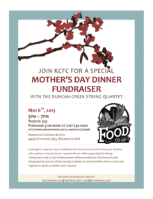 Looking for a special way to celebrate the woman you love? Come treat your Mother, wife, partner or loved one to a special dinner while supporting the Kitsap Community Food Co-op! Entertainment will be provided by The Duncan Creek String Quartet and we will be serving a Salmon & Chicken Buffet with a no host bar. A vegetarian option is available for those who would like it, please contact membership coordinator, Jess Sappington, after you purchase your tickets to request the vegetarian meal.