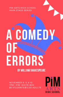 Comedy of Errors by William Shakespeare is one of his earliest plays. Come join an English troupe as they present their own version of the Bards play. It is part circus, farce, mistaken identities, confused lovers and general silliness. Some might even call it experimental and magical.