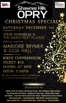 Get in the Christmas Spirit December 1st at Kiki's CoffeeHouse! The Shawnee Hills Opry Christmas Special is always a special night of music. Our special guest will be Marjorie Btymer and Julia Hall. As always, the house band Steve Hornbeak & The Mainstreet Players will be performing. Doors will open at 6pm for cocktails, beer, wine and your favorite coffee drinks. Check back to see what discounts our downtown restaurants and stores will offer by showing them your Opry ticket. Show starts at 7:30pm