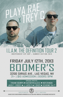 The success of their last tour I.L.A.M. The Definition Tour #1 has been evident. Touching 16 cities and 5 states in a month and a half, the reviews have been great. The momentum is strong and people are grasping the fact that these two are changing the way Independent Hip Hop can be pushed, packaged and sold. No Deals here...strictly independent with a strong connection to the everyday artist and person a like in whatever you do in your life.