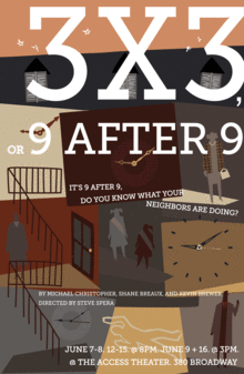 3x3, or, 9 after 9 will run for 8 performances June 7th-16th at The Access Theatre. Shows on Sunday start at 3pm. All other shows begin at 8pm.