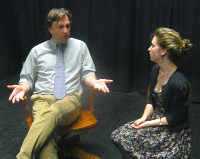 "True to the mission implied in its name, Spare Stage offers dramatic purity en lieu of flashy stage concepts in this beautifully calibrated, consistently stimulating production of David Mamet's 1992 two-hander, about a university professor (Aaron Murphy) and the female undergrad (Frannie Morrison) who accuses him of sexual misconduct. The action takes place exclusively inside the small office where John, on the verge of gaining tenure and simultaneously closing a deal on a new house, meets with his failing student Carol, a young woman who, ironically enough, seems lost by the concepts her professor deploys in his lectures on the social underpinnings of higher education (insights he recycles from his recently minted book, which is naturally the assigned reading).