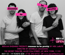 Bedlam Ensemble returns to the Secret Theater this Spring with a production of Neil LaBute's 2009 Tony nominated play, reasons to be pretty.